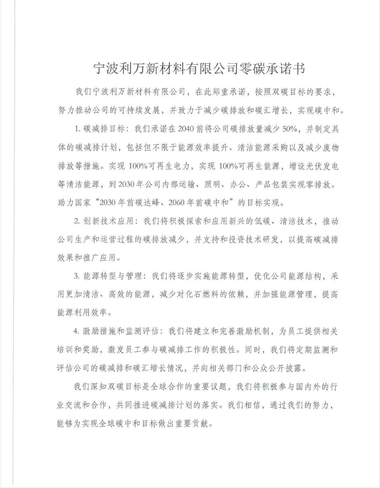 宁波利万新材料有限公司零碳承诺书